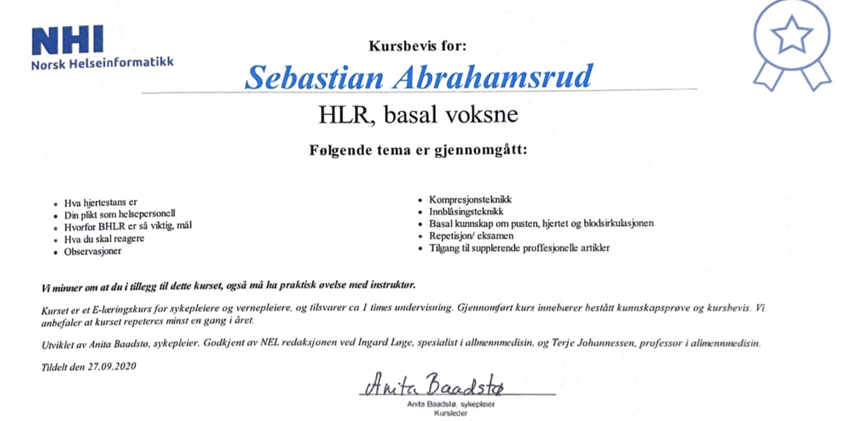 Førstehjelp er ferskvare og det er noe man aldri får trent nok på! Gjennom dette oppmøtebaserte kurset får du teori, scenariotrening og god kjennskap til norske HLR-retningslinjer. Vi tilpasser opplæringen etter NRR (Norsk resusitasjonsråd) sine retningslinjer. Dette danner blant annet et solid grunnlag som livreddende førstehjelper!